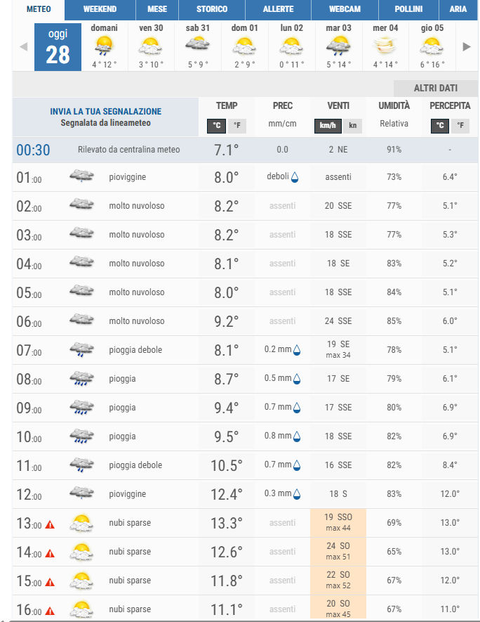A Jesi cieli molto nuvolosi o coperti con deboli piogge, in rapido assorbimento dal tardo pomeriggio, fino a cieli sereni o poco nuvolosi in serata, sono previsti 7mm di pioggia. Durante la giornata di domani la temperatura massima registrata sarà di 13°C, la minima di 8°C, lo zero termico si attesterà a 2020m. I venti saranno al mattino tesi e proverranno da Sud-Sudest, al pomeriggio forti e proverranno da Sudovest. Allerte meteo previste: vento.