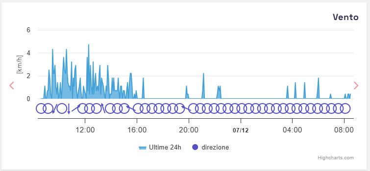 | 06/12/2025 | 5.8 | 9.5 | 15.7 | 61 | 79 | 88 | 0.00 | 15.5 | 0.5 | ESE | 1012.5 | 101 | 0.2 | Sì | |||
