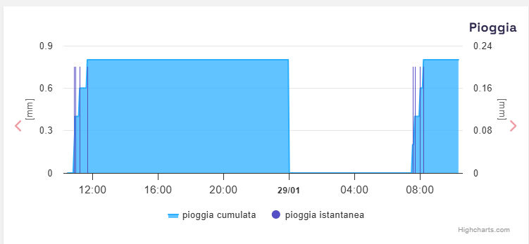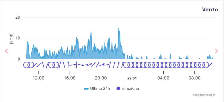 | 27/01/2026 | 1.1 | 6.8 | 13.4 | 57 | 76 | 88 | 1.00 | 8.6 | 0.7 | ENE | 1006.6 | 145 | 0.4 | Sì | |||