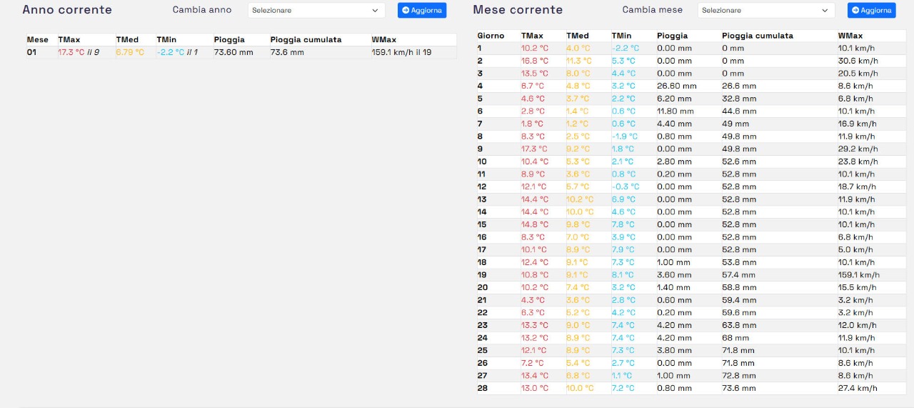 | Data | Temp. Min | Temp. Med | Temp. Max | Umid. Min | Umid. Med | Umid. Max | Pioggia | Neve | Neve Max Giorn. | Neve Max Evento | Raffica | Vento med | Dir vento | Pressione | Radiazione Med | UV Med | Autocons. |