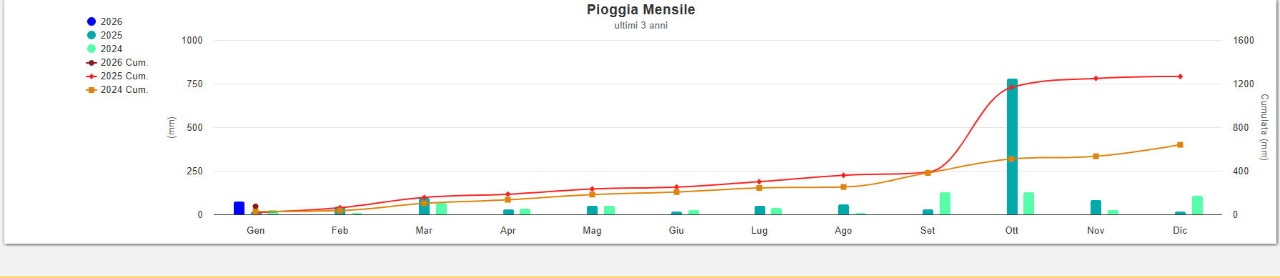| 27/01/2026 | 1.1 | 6.8 | 13.4 | 57 | 76 | 88 | 1.00 | 8.6 | 0.7 | ENE | 1006.6 | 145 | 0.4 | Sì | |||